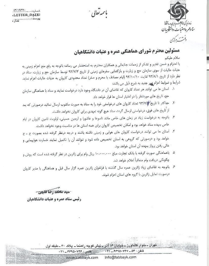 همکارانی و دانشجویانی که مایل هستند مطابق دستور العمل ذیل به عتبات عالیات مشرف شوند می بایستی تا تاریخ3 مهر سال93 با شماره تلفن33302154 داخلی 204 واحد فرهنگی اعلام آمادگی نمایند.
