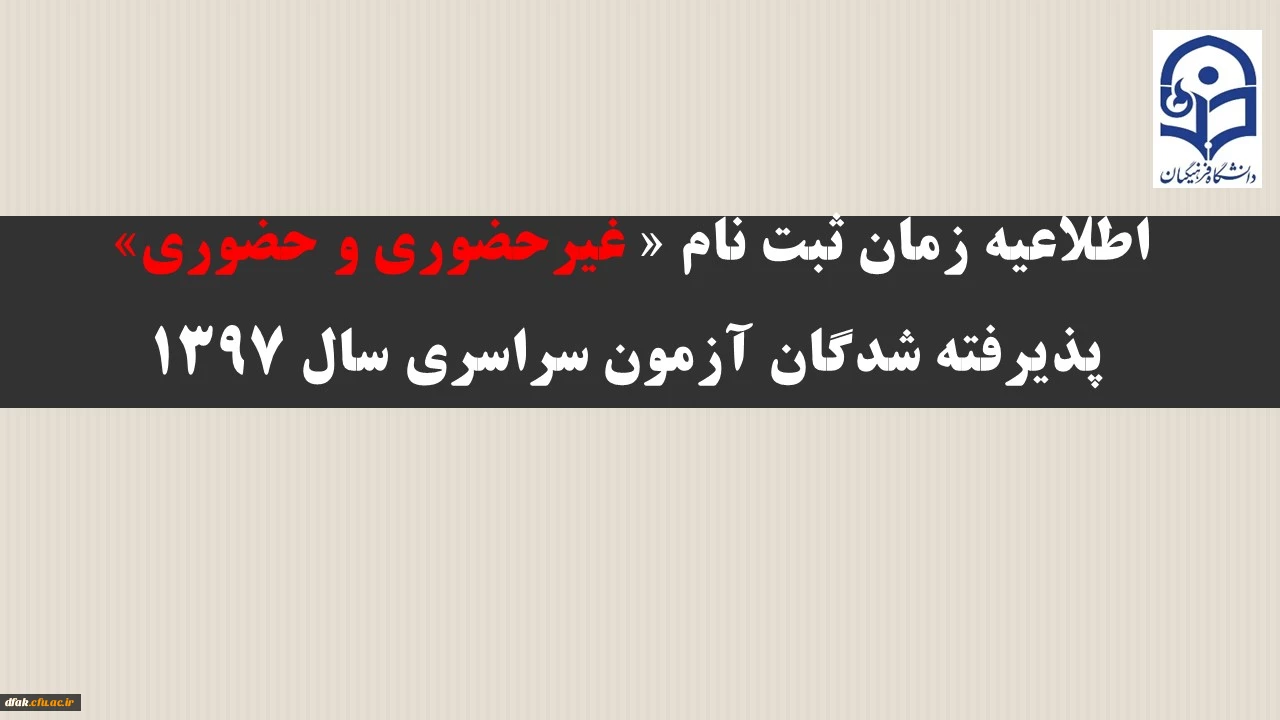 امتیاز دهید : اطلاعیه زمان ثبت نام « غیرحضوری و حضوری» پذیرفته شدگان آزمون سراسری سال 1397 چهارشنبه 21 شهریور 1397 ساعت 13:08