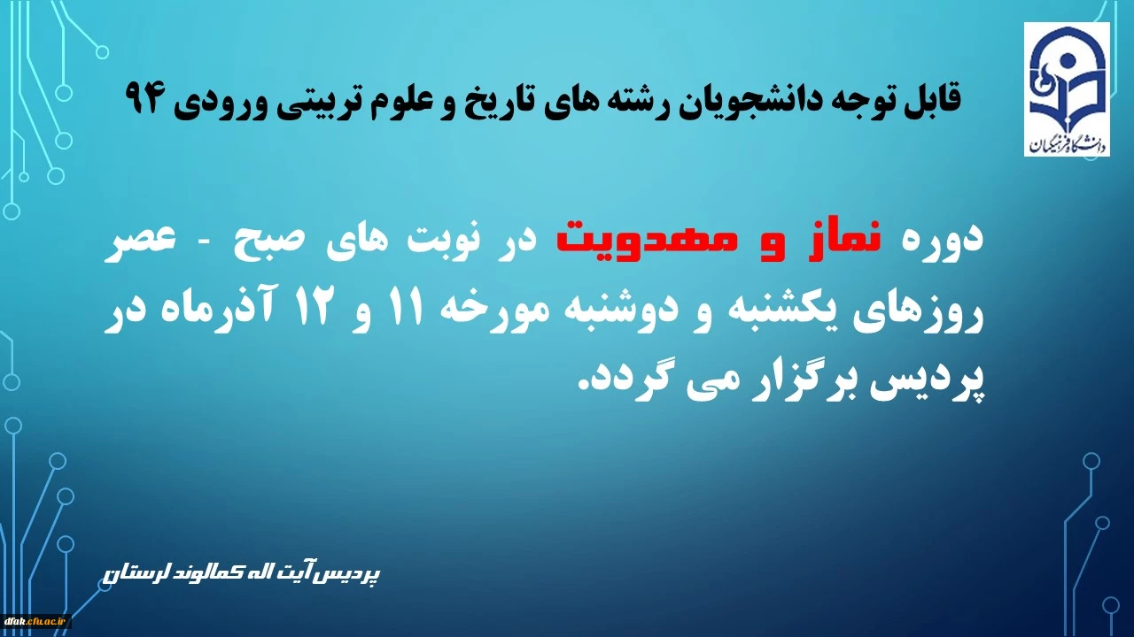 اطلاعیه : برگزاری دوره نماز و مهدویت ویژه دانشجویان رشته های تاریخ و علوم تربیتی ورودی 94