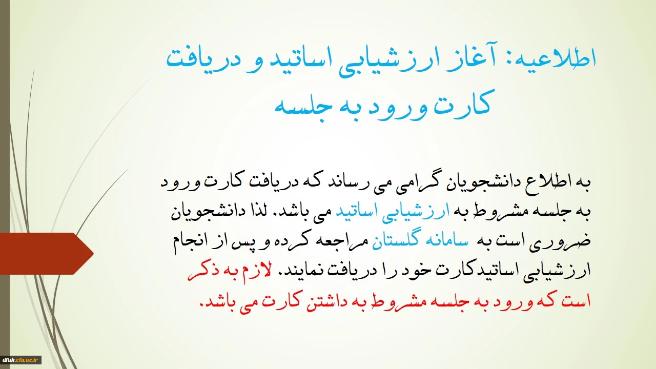 امتیاز دهید : اطلاعیه: آغاز ارزشیابی اساتید و دریافت کارت ورود به جلسه چهارشنبه 12 دی 1397 ساعت 10:44