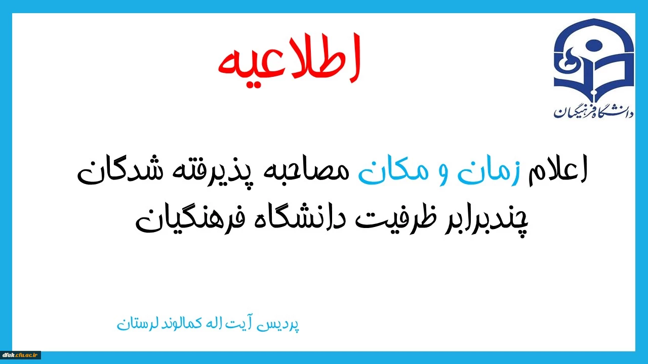 امتیاز دهید : اعلام زمان و مکان مصاحبه پذیرفته شدگان (خواهر) دانشگاه فرهنگیان چهارشنبه 6 شهریور 1398 ساعت 9:35