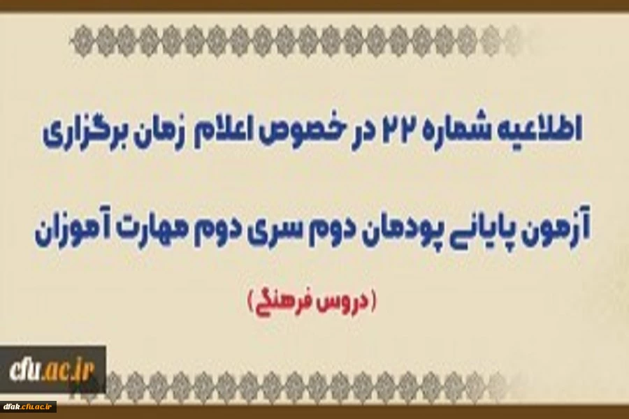 اطلاعیه شماره 22 در خصوص اعلام زمان برگزاری آزمون پایانی پودمان دوم سری دوم مهارت آموزان (دروس فرهنگی) 2